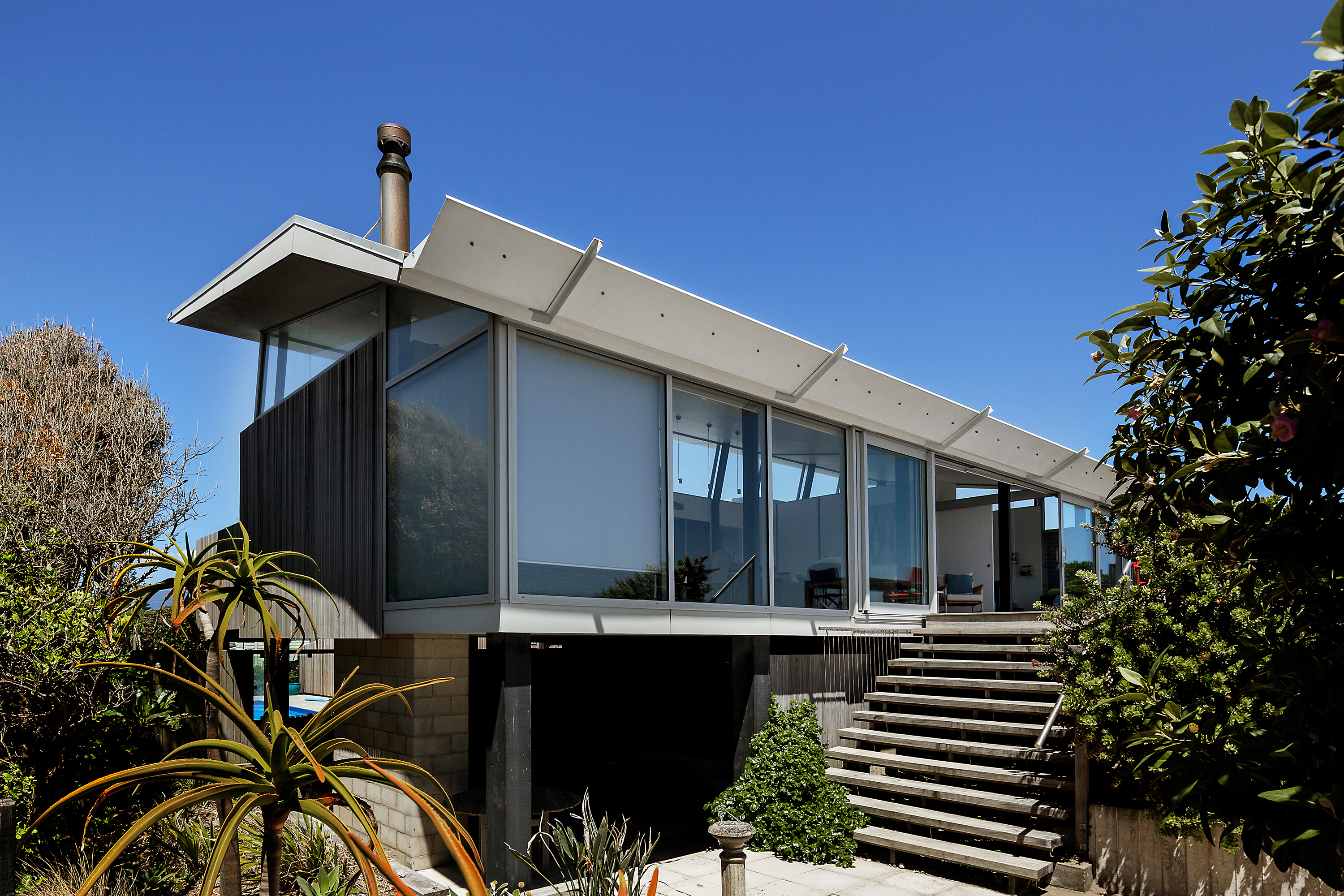 The "gull wing" roof relates loosely to the sand dunes beyond the site. The house has adult and teenage